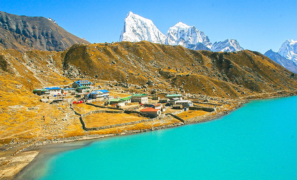 You begin early to climb Renjo La Pass. The ascent is steep and demanding but rewarded with spectacular views of the Gokyo Lakes and surrounding peaks. Prayer flags mark the pass, adding a spiritual element to the landscape. The descent into the Gokyo Valley reveals turquoise glacial lakes and snow-covered peaks. Cho Oyu dominates the skyline. Gokyo village, beside the third lake, offers a serene alpine setting. Afternoon rest is crucial after the long climb, with time to explore the village or nearby lakes.